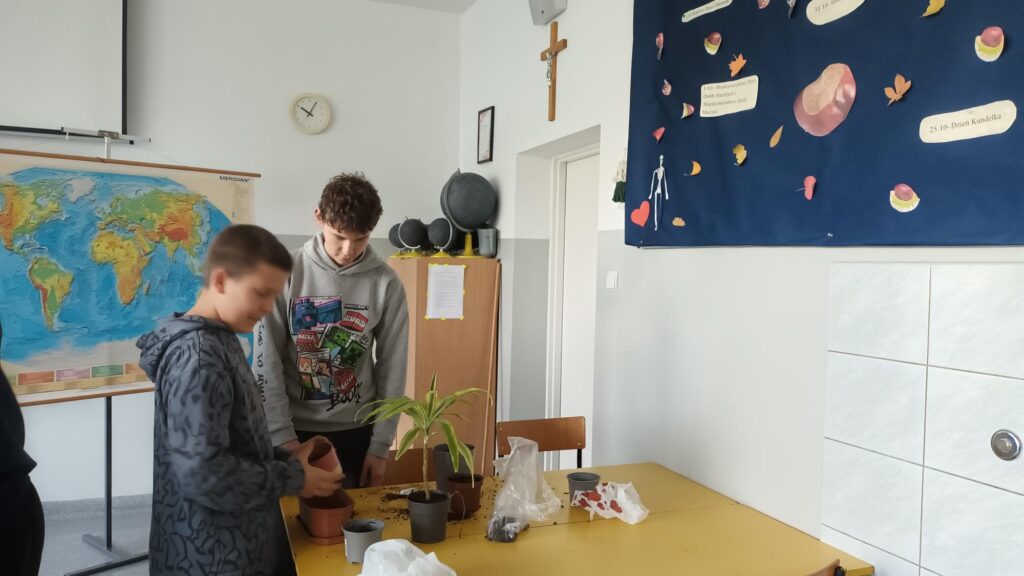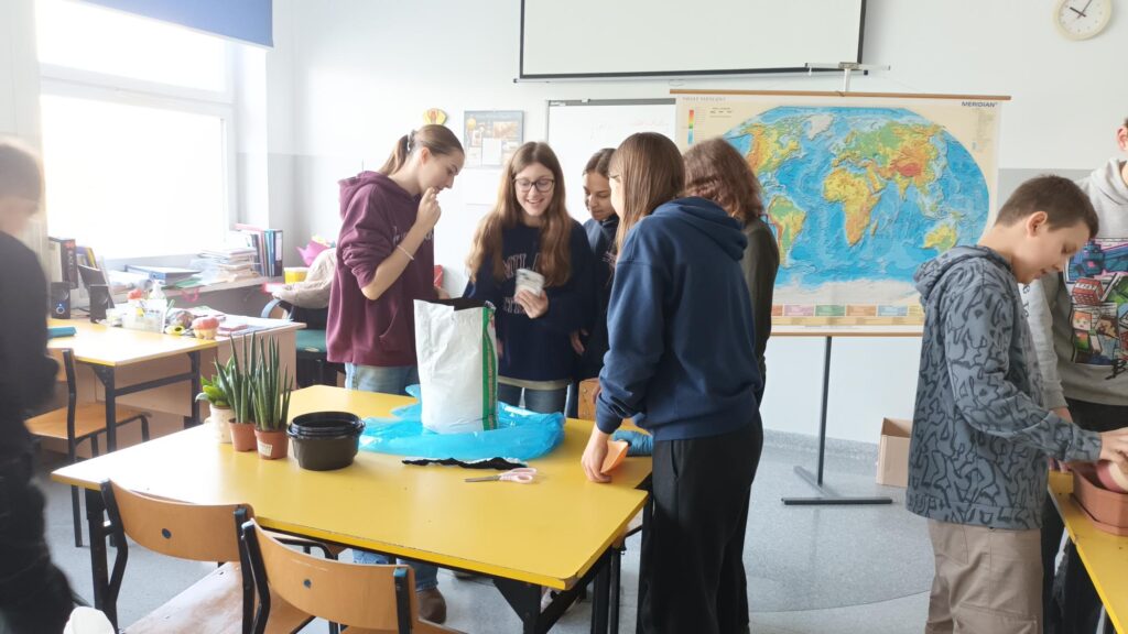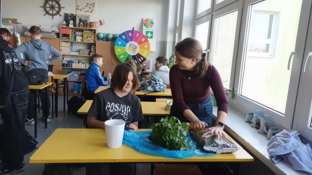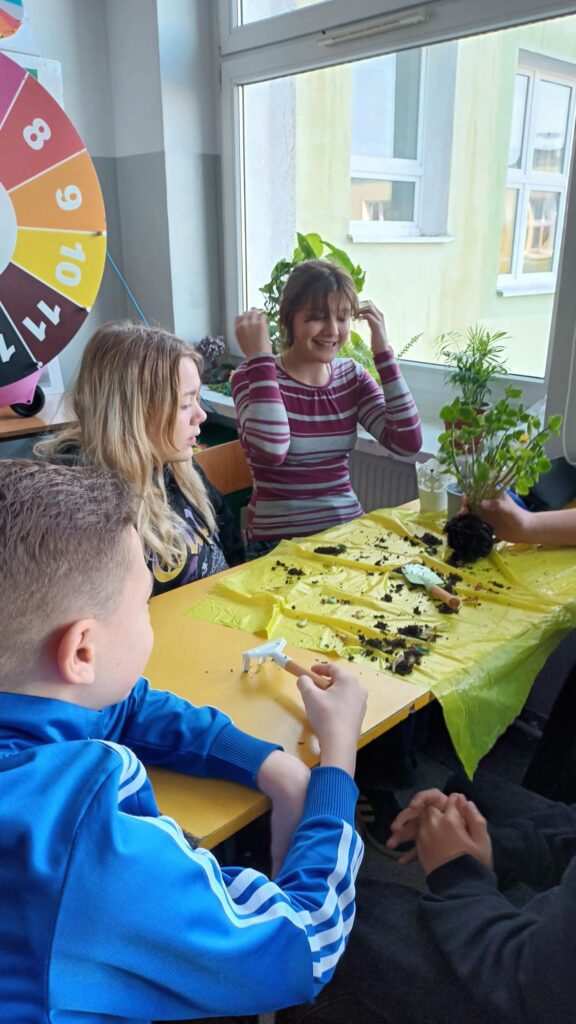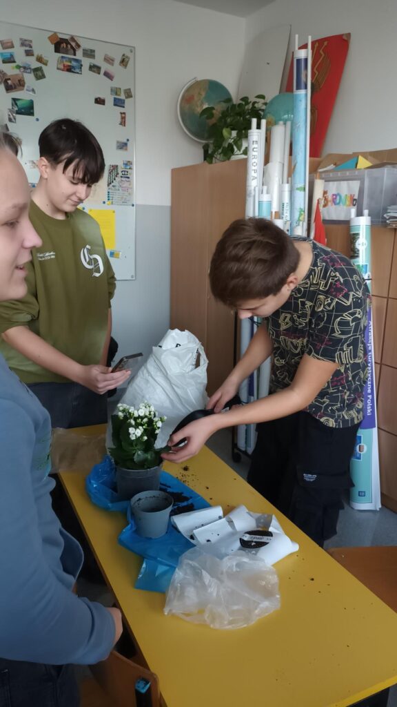 W ramach lekcji geografii o glebach klasa 7a zamieniła teorię w praktykę i… uczyła się przesadzania kwiatów!