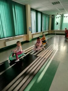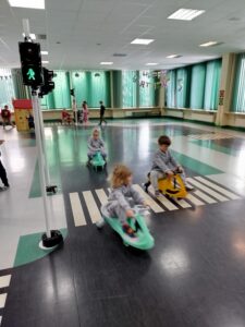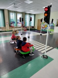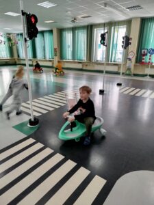 27 grudnia grupa „Słoneczka” odwiedziła Wojewódzki Ośrodek Ruchu Drogowego. Podczas wycieczki dzieci utrwaliły zasady bezpiecznego poruszania się po drogach oraz wzięły udział w zajęciach przygotowanych przez pracowników WORD. Najwięcej radości sprawiła im możliwość zabawy na specjalnie przygotowanym placu, gdzie mogły wcielić się zarówno w rolę pieszych, jak i kierujących grawitacyjnymi samochodami. To była wspaniała przygoda!