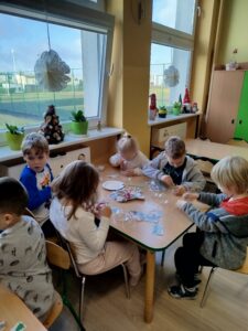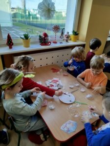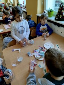 Dzieci brały udział w warsztatach plastycznych, podczas których dzieci własnoręcznie wykonywały bombki metodą decoupage. Przedszkolaki z entuzjazmem wybierały wzory, ozdabiały bombki i rozwijały swoje zdolności manualne oraz kreatywność. Powstałe prace zachwycały kolorami i pomysłowością, a każda bombka była niepowtarzalna.
