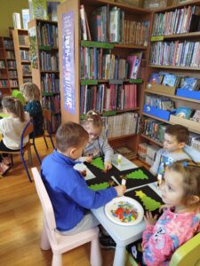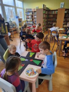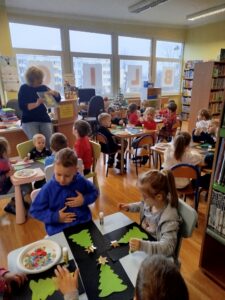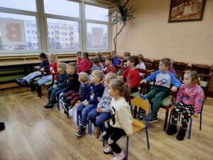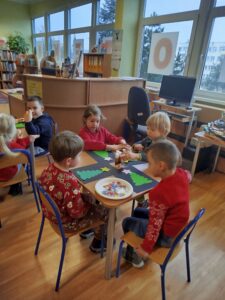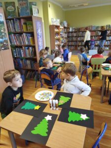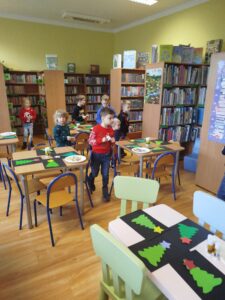 Kolejną przedświąteczną atrakcją było wyjście do Biblioteki Publicznej na zajęcia o tematyce świątecznej. Dzieci wysłuchały świątecznego opowiadania, rozmawiały o tradycjach bożonarodzeniowych oraz brały udział w ciekawych zabawach przygotowanych przez pracowników biblioteki.