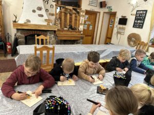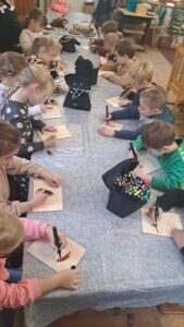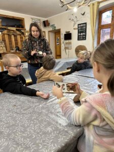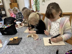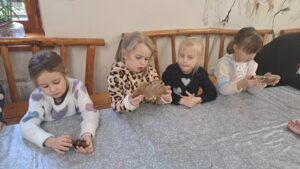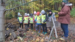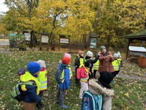 Grupa Promyczki uczestniczyła w warsztatach ,,Jesień w lesie". Dzieci odkrywały tajemnice lasu- obserwowały tamę zbudowaną przez bobra i dowiedziały się jak wygląda dom żab. Poznały różne gatunki grzybów, rozmawiały o zwierzętach przygotowujących się do zimowego snu i same zamieniły się w małych artystów, kolorując jesienne grzybki.