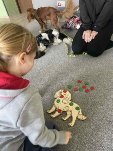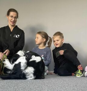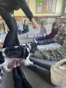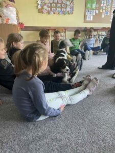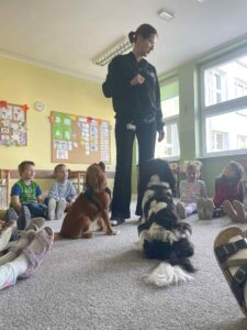 Grupa Gwiazdek uczestniczyła w zajęciach z dogoterapii. Dzieci uczyły się, jak rozmawiać z psem, jak go głaskać i jak okazywać emocje w sposób bezpieczny i przyjazny. To doskonała okazja do nauki empatii, spokoju i odpowiedzialności poprzez zabawę.